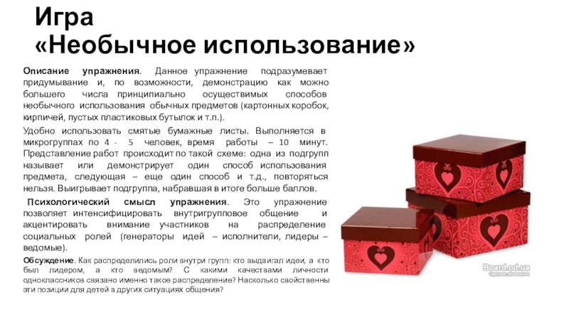 демонстрацию как можно большего числа принципиально осуществимых способов необычного использования обычных предметов (картонных коробок, кирпичей, пустых пластиковых бутылок и т.п.).