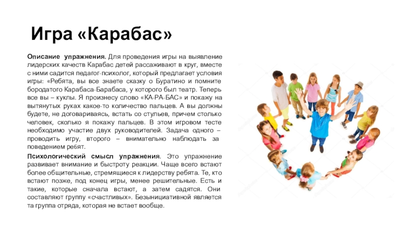 Описание упражнения. Для проведения игры на выявление лидерских качеств Карабас