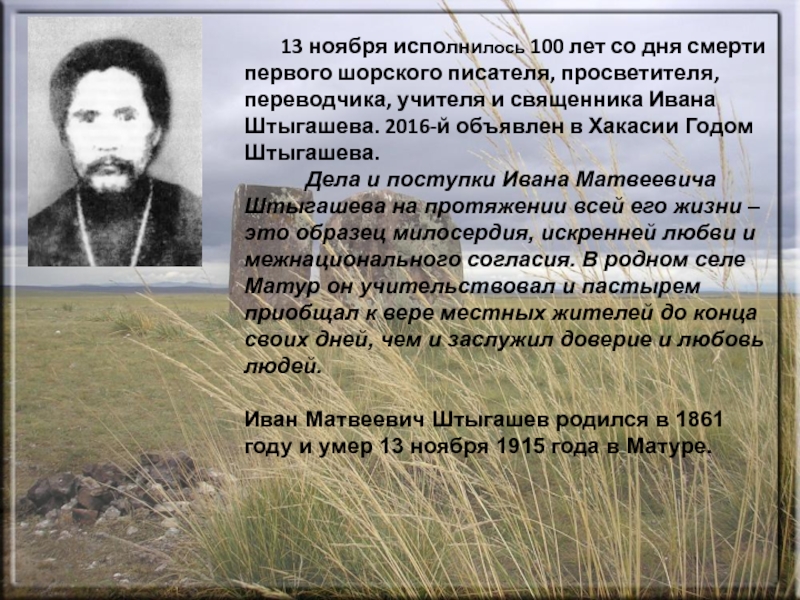 первого шорского писателя, просветителя, переводчика, учителя и священника Ивана Штыгашева. 2016-й объявлен в Хакасии Годом Штыгашева.