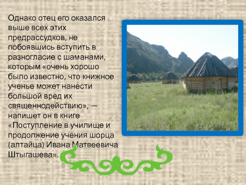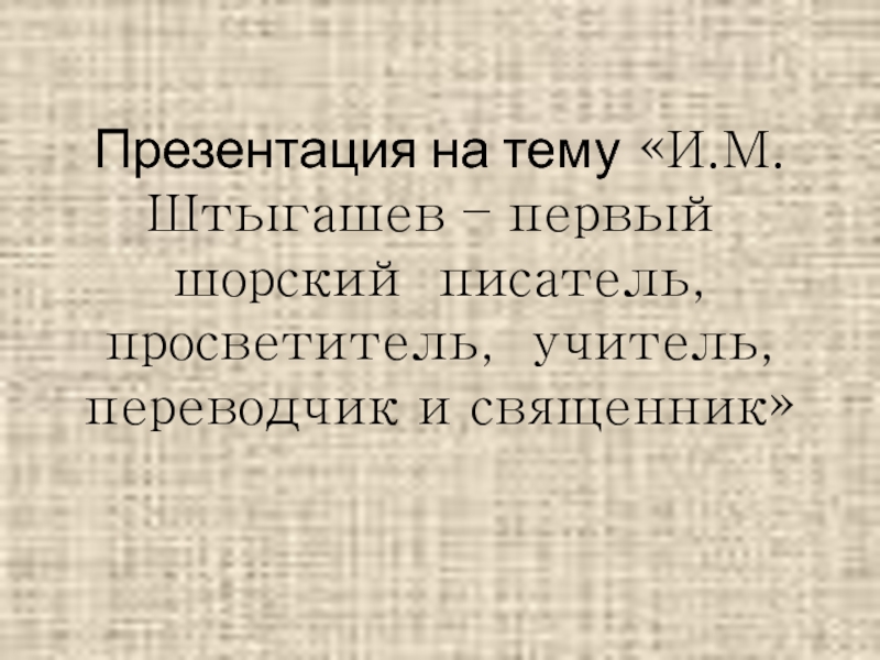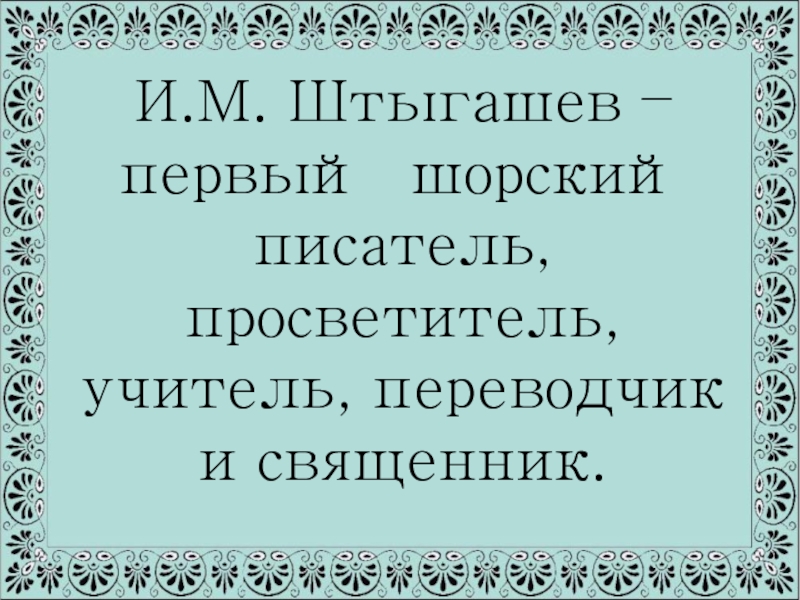 Слайд 1Презентация на тему «И.М. Штыгашев – первый шорский писатель, просветитель, учитель,
