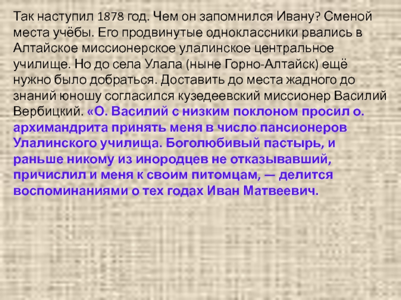 Его продвинутые одноклассники рвались в Алтайское миссионерское улалинское центральное училище. Но до села Улала (ныне Горно-Алтайск) ещё нужно было добраться. Доставить до места жадного до знаний юношу согласился кузедеевский миссионер Василий Вербицкий. «О. Василий с низким поклоном просил о. архимандрита принять меня в число пансионеров Улалинского училища. Боголюбивый пастырь, и раньше никому из инородцев не отказывавший, причислил и меня к своим питомцам, — делится воспоминаниями о тех годах Иван Матвеевич.
