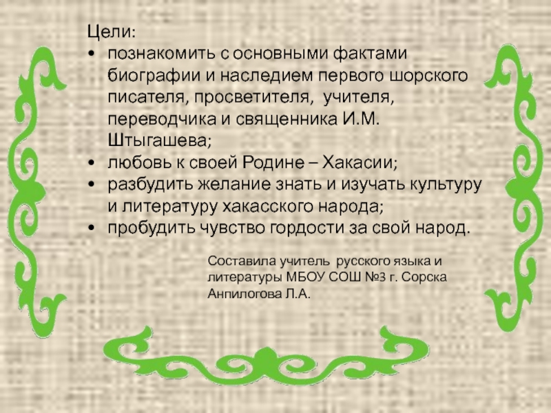 познакомить с основными фактами биографии и наследием первого шорского писателя,