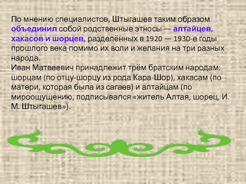 Слайд 11По мнению специалистов, Штыгашев таким образом объединил собой родственные этносы —