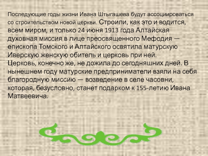 Слайд 14Последующие годы жизни Ивана Штыгашева будут ассоциироваться со строительством новой церкви.