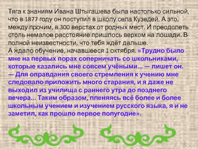 Слайд 7Тяга к знаниям Ивана Штыгашева была настолько сильной, что в 1877