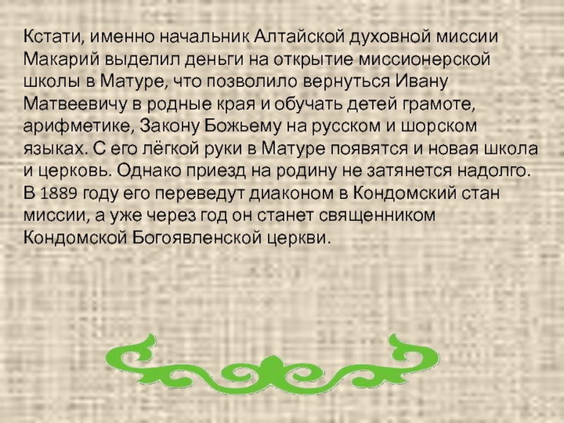 Слайд 12Кстати, именно начальник Алтайской духовной миссии Макарий выделил деньги на открытие