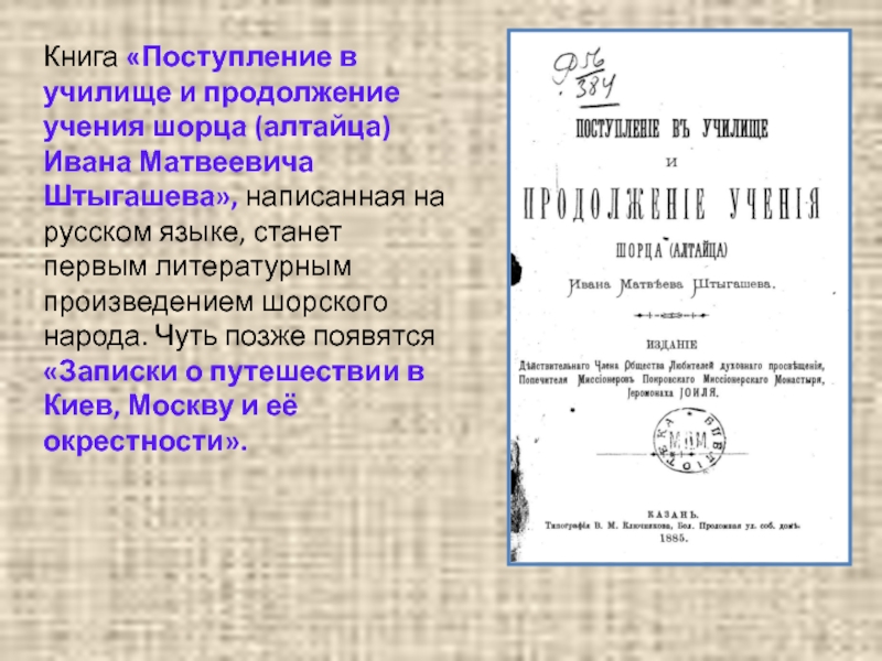 Слайд 10Книга «Поступление в училище и продолжение учения шорца (алтайца) Ивана Матвеевича