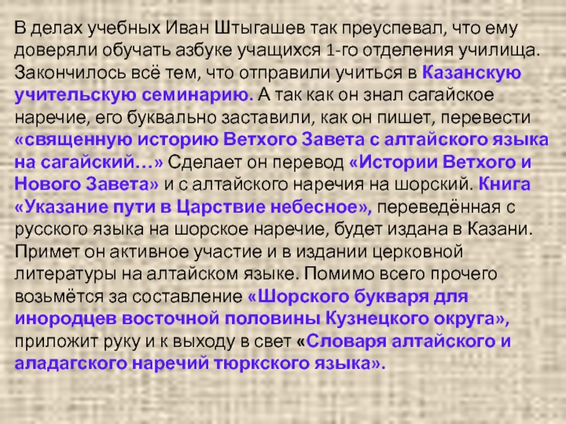 азбуке учащихся 1-го отделения училища. Закончилось всё тем, что отправили учиться в Казанскую учительскую семинарию. А так как он знал сагайское наречие, его буквально заставили, как он пишет, перевести «священную историю Ветхого Завета с алтайского языка на сагайский…» Сделает он перевод «Истории Ветхого и Нового Завета» и с алтайского наречия на шорский. Книга «Указание пути в Царствие небесное», переведённая с русского языка на шорское наречие, будет издана в Казани. Примет он активное участие и в издании церковной литературы на алтайском языке. Помимо всего прочего возьмётся за составление «Шорского букваря для инородцев восточной половины Кузнецкого округа», приложит руку и к выходу в свет «Словаря алтайского и аладагского наречий тюркского языка».