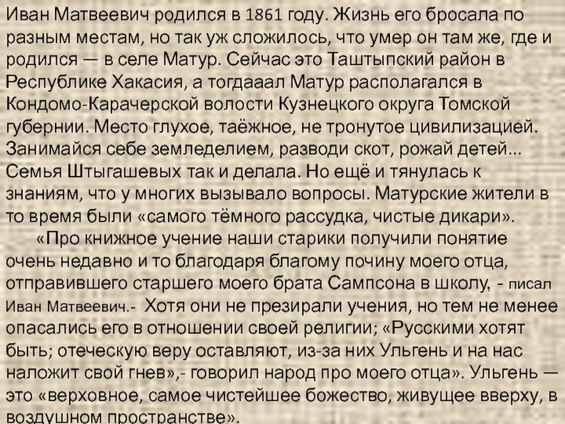 местам, но так уж сложилось, что умер он там же, где и родился — в селе Матур. Сейчас это Таштыпский район в Республике Хакасия, а тогдааал Матур располагался в Кондомо-Карачерской волости Кузнецкого округа Томской губернии. Место глухое, таёжное, не тронутое цивилизацией. Занимайся себе земледелием, разводи скот, рожай детей... Семья Штыгашевых так и делала. Но ещё и тянулась к знаниям, что у многих вызывало вопросы. Матурские жители в то время были «самого тёмного рассудка, чистые дикари».