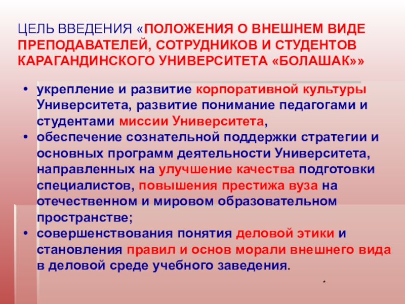 укрепление и развитие корпоративной культуры Университета, развитие понимание педагогами и студентами миссии Университета,
