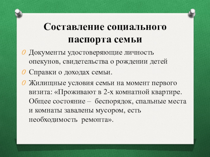 Жилищные условия семьи на момент первого визита: «Проживают в 2-х комнатной квартире. Общее состояние – беспорядок, спальные места и комнаты завалены мусором, есть необходимость ремонта».