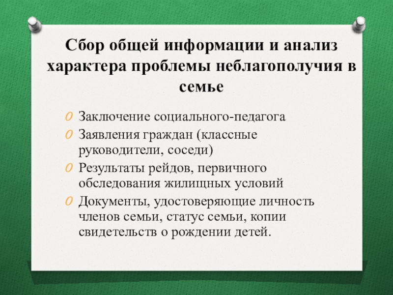 Слайд 4Сбор общей информации и анализ характера проблемы неблагополучия в семье