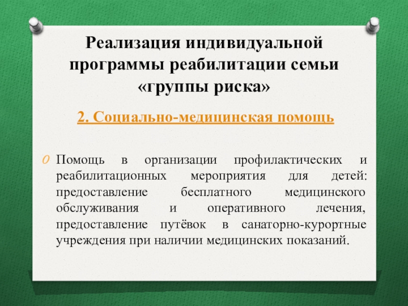 профилактических и реабилитационных мероприятия для детей: предоставление бесплатного медицинского обслуживания и оперативного лечения, предоставление путёвок в санаторно-курортные учреждения при наличии медицинских показаний.