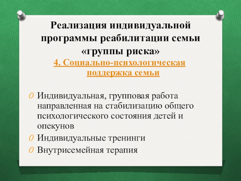 Слайд 11Реализация индивидуальной программы реабилитации семьи «группы риска»
