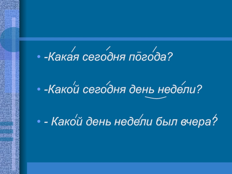 -Какая сегодня погода?-Какой сегодня день недели?- Какой день недели был вчера?