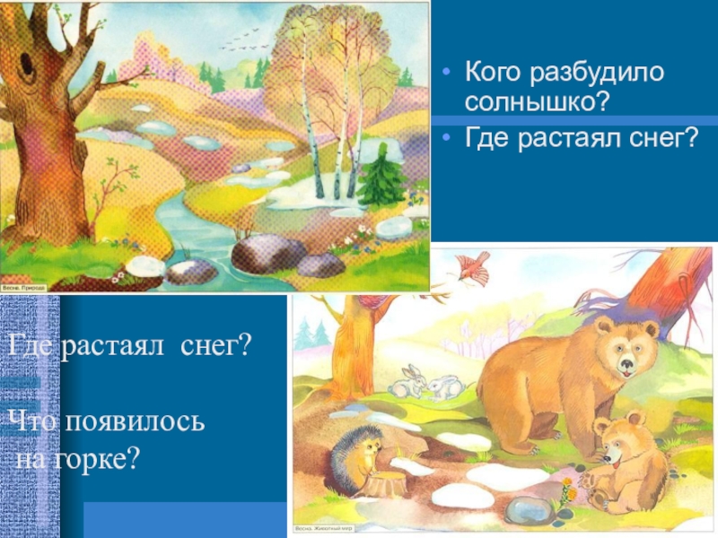 Кого разбудило солнышко?Где растаял снег?Где растаял снег?Что появилось на горке?