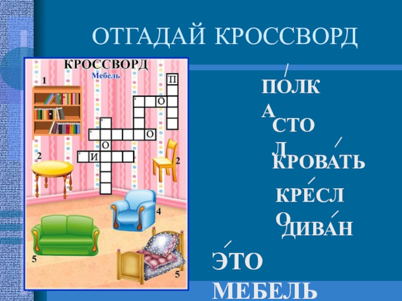 ОТГАДАЙ КРОССВОРДПОЛКАСТОЛКРОВАТЬКРЕСЛОДИВАНЭТО МЕБЕЛЬ