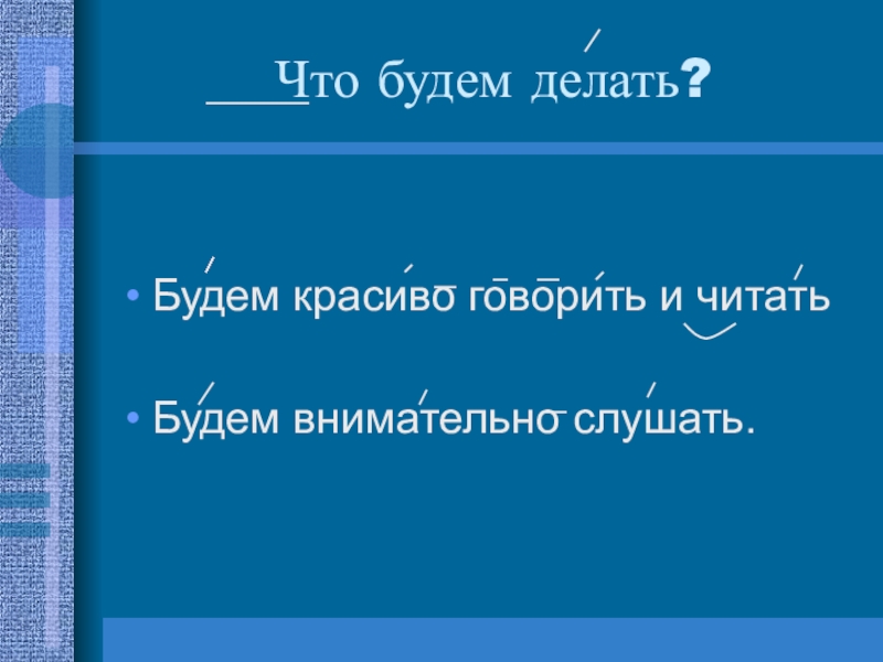 Что будем делать?Будем красиво говорить и читатьБудем внимательно слушать.