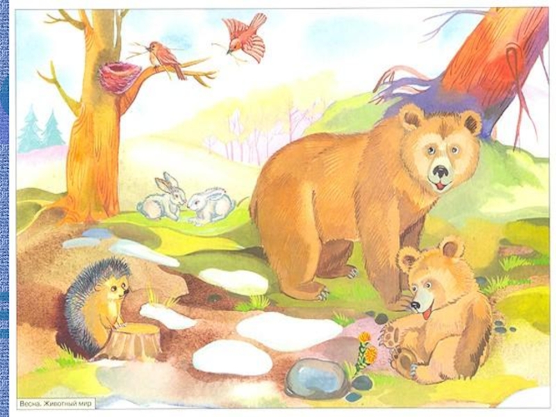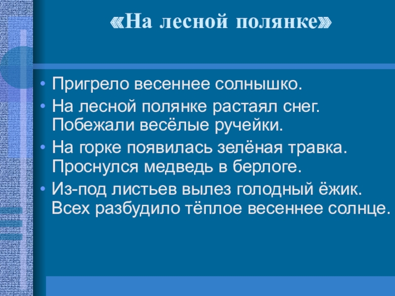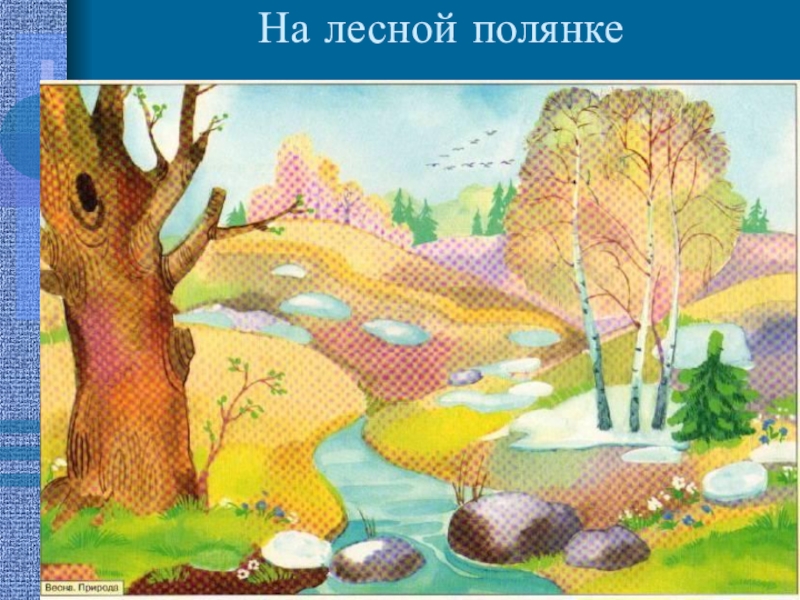 «На лесной полянке» Пригрело весеннее солнышко. На лесной полянке растаял снег. Побежали весёлые ручейки. На горке появилась