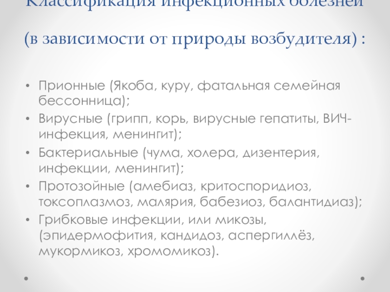 Слайд 6Классификация инфекционных болезней (в зависимости от природы возбудителя) :