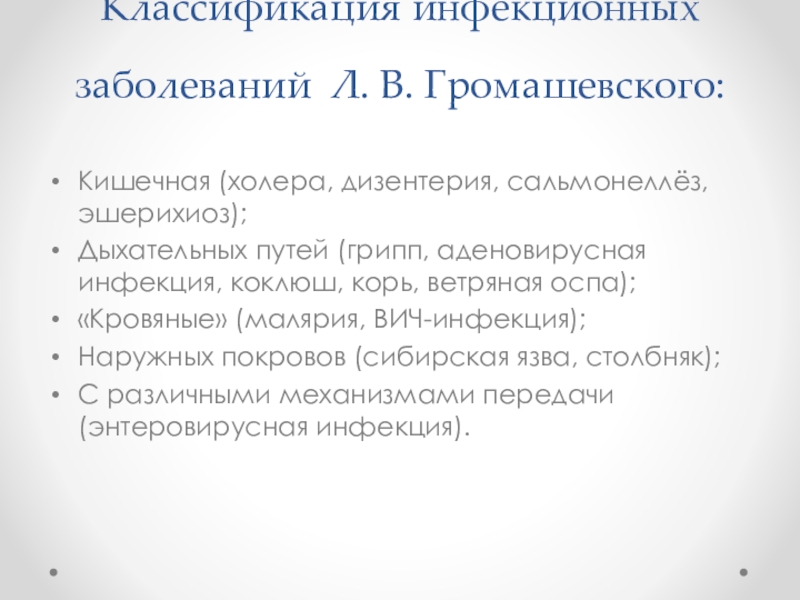 Слайд 5Классификация инфекционных заболеваний Л. В. Громашевского: