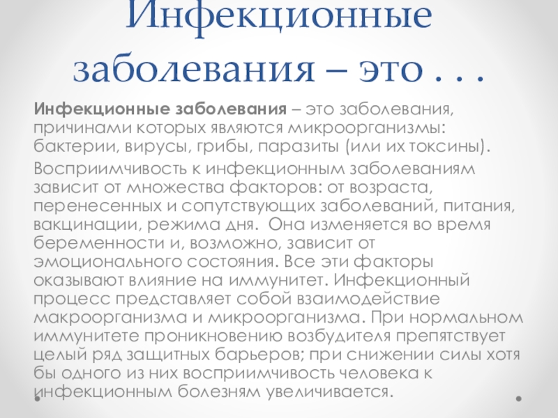 Восприимчивость к инфекционным заболеваниям зависит от множества факторов: от возраста, перенесенных и сопутствующих заболеваний, питания, вакцинации, режима дня. Она изменяется во время беременности и, возможно, зависит от эмоционального состояния. Все эти факторы оказывают влияние на иммунитет. Инфекционный процесс представляет собой взаимодействие макроорганизма и микроорганизма. При нормальном иммунитете проникновению возбудителя препятствует целый ряд защитных барьеров; при снижении силы хотя бы одного из них восприимчивость человека к инфекционным болезням увеличивается.