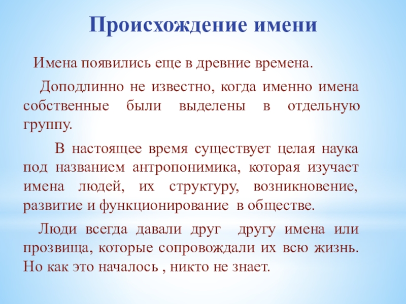 В настоящее время существует целая наука под названием антропонимика, которая изучает имена людей, их структуру, возникновение, развитие и функционирование в обществе.