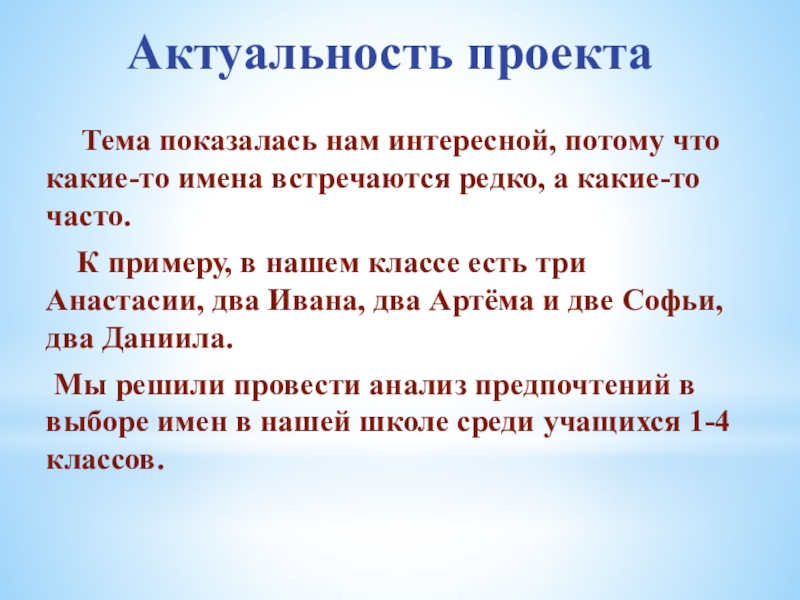 Мы решили провести анализ предпочтений в выборе имен в нашей школе среди учащихся 1-4 классов.
