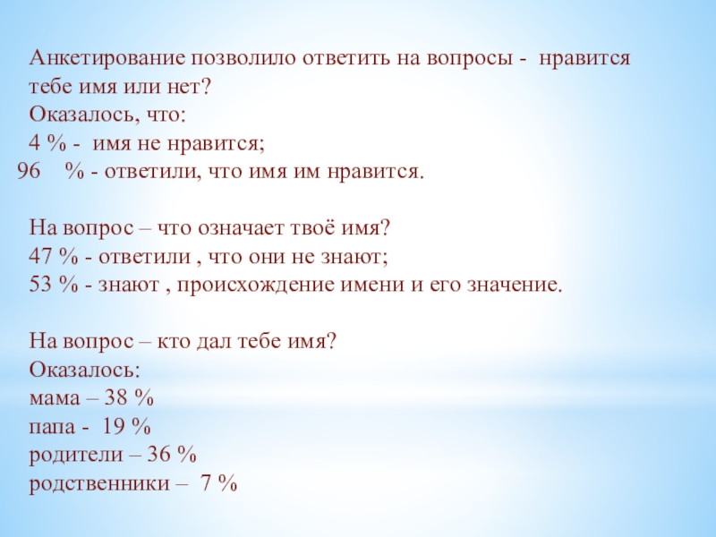 Слайд 17Анкетирование позволило ответить на вопросы - нравится тебе имя или нет?