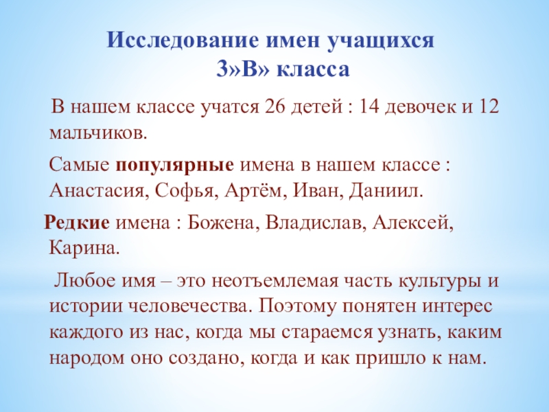 Самые популярные имена в нашем классе : Анастасия, Софья, Артём, Иван, Даниил.