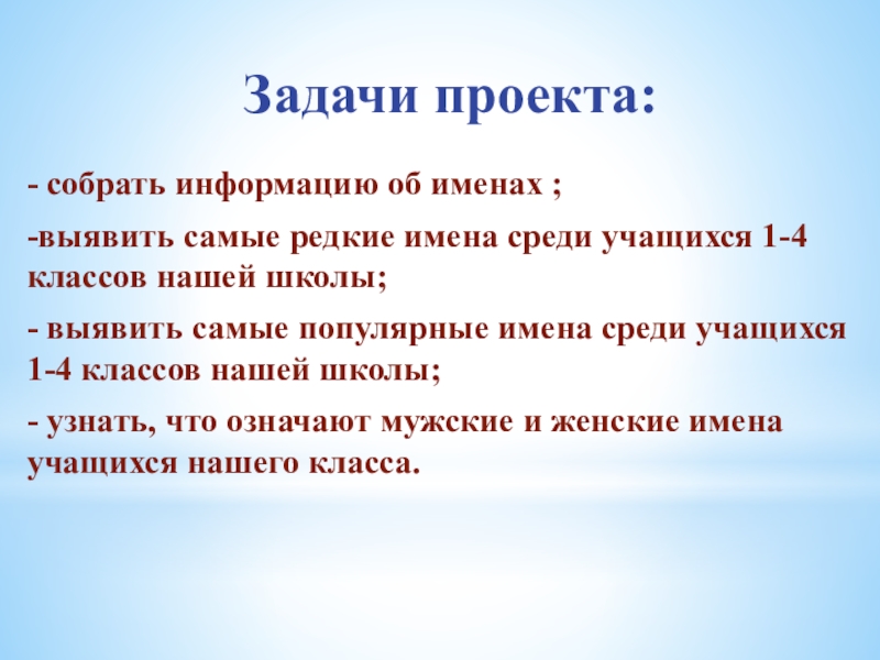 - выявить самые популярные имена среди учащихся 1-4 классов нашей школы;