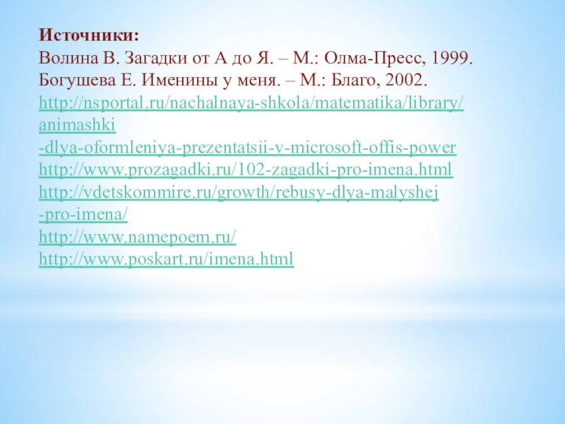 Волина В. Загадки от А до Я. – М.: Олма-Пресс, 1999.