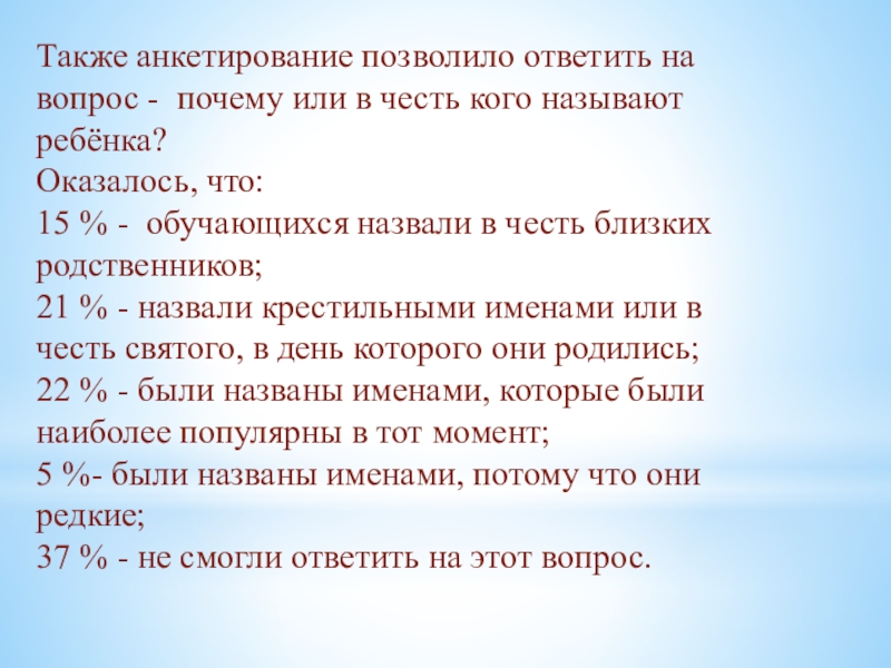 Слайд 16Также анкетирование позволило ответить на вопрос - почему или в честь