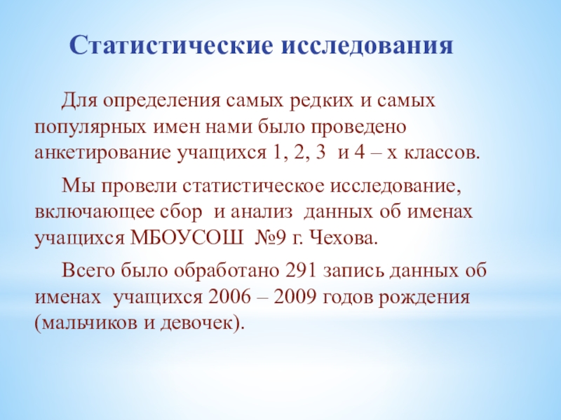 Мы провели статистическое исследование, включающее сбор и анализ данных об именах учащихся МБОУСОШ №9 г. Чехова.