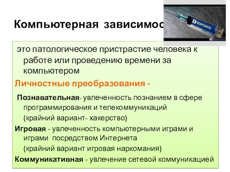 Компьютерная зависимость это патологическое пристрастие человека к работе или проведению времени за компьютеромЛичностные преобразования - Познавательная- увлеченность познанием в сфере программирования и телекоммуникаций (крайний вариант- хакерство)Игровая - увлеченность компьютерными играми
