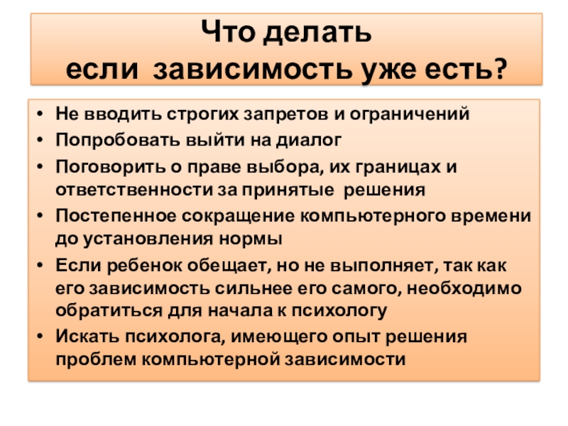 Что делать  если  зависимость уже есть?Не вводить строгих запретов и ограниченийПопробовать выйти на диалогПоговорить о праве