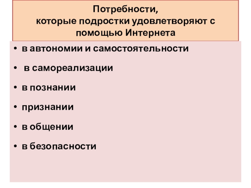 Потребности,  которые подростки удовлетворяют с помощью Интернетав автономии и самостоятельности  в самореализациив познаниипризнании в общениив безопасности