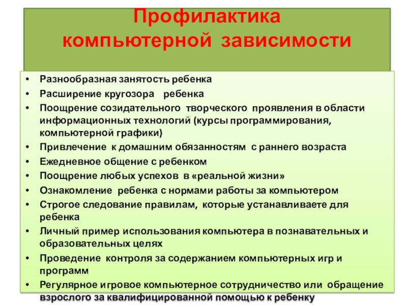 Профилактика  компьютерной зависимости  Разнообразная занятость ребенка Расширение кругозора  ребенка Поощрение созидательного творческого проявления в области