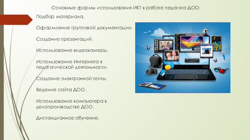 Слайд 7Основные формы использования ИКТ в работе педагога ДОО: