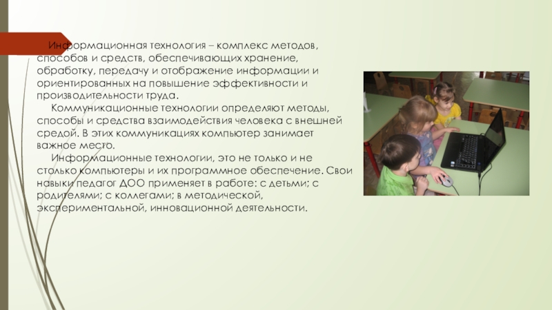 Информационные технологии, это не только и не столько компьютеры и их программное обеспечение. Свои навыки педагог ДОО применяет в работе: с детьми; с родителями; с коллегами; в методической, экспериментальной, инновационной деятельности.