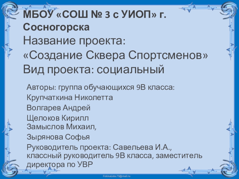 Руководитель проекта: Савельева И.А., классный руководитель 9В класса, заместитель директора по УВР