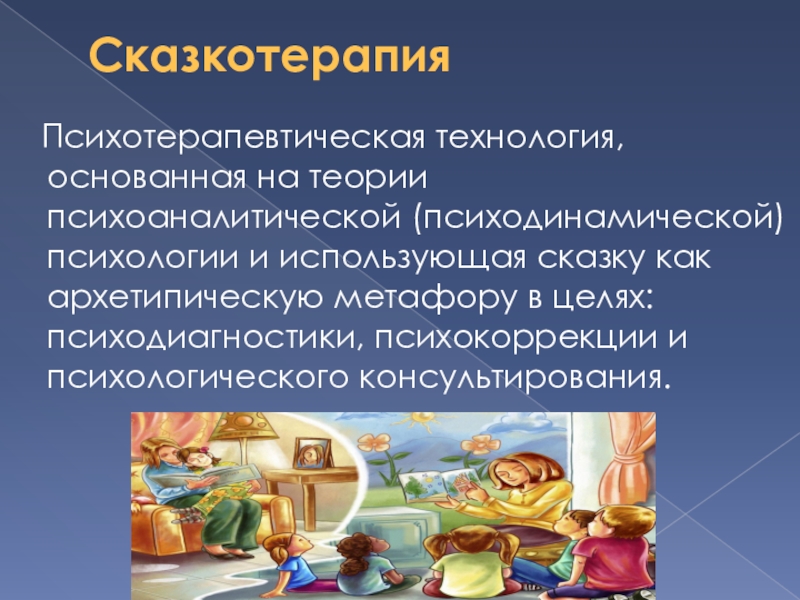 Сказкотерапия  Психотерапевтическая технология, основанная на теории психоаналитической (психодинамической) психологии и использующая сказку как архетипическую метафору в
