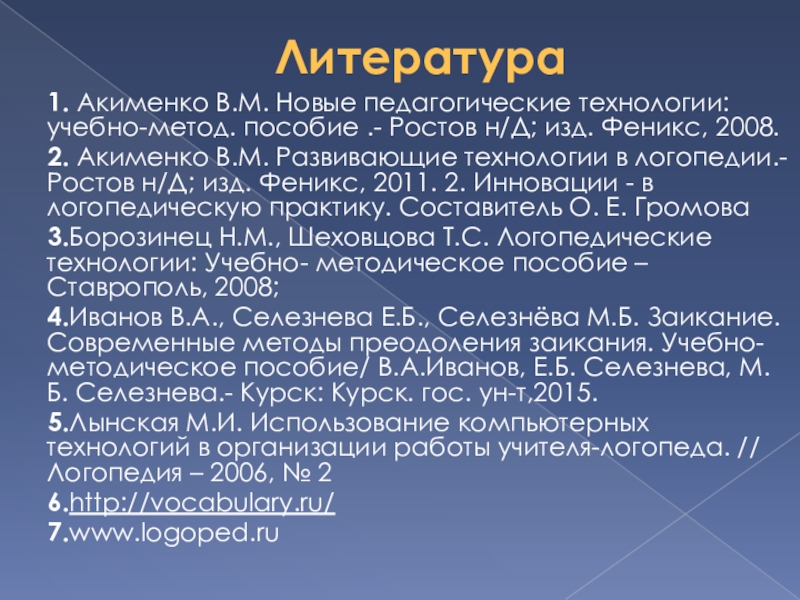 Литература 	1. Акименко В.М. Новые педагогические технологии: учебно-метод. пособие .- Ростов н/Д; изд. Феникс, 2008. 	2. Акименко