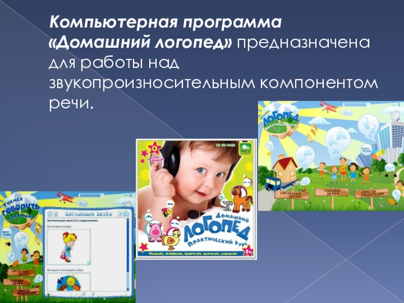 Слайд 11 Компьютерная программа «Домашний логопед» предназначена для работы над звукопроизносительным компонентом речи.