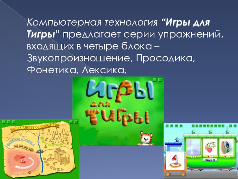 Компьютерная технология “Игры для Тигры” предлагает серии упражнений, входящих в четыре блока – Звукопроизношение, Просодика, Фонетика, Лексика,