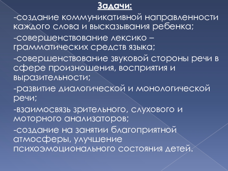Задачи:	-создание коммуникативной направленности каждого слова и высказывания ребенка;	-совершенствование лексико – грамматических средств языка;	-совершенствование звуковой стороны речи в