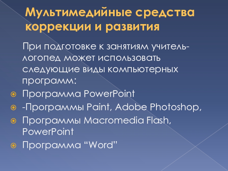 Мультимедийные средства коррекции и развития 	При подготовке к занятиям учитель-логопед может использовать следующие виды компьютерных программ:Программа PowerPoint-Программы
