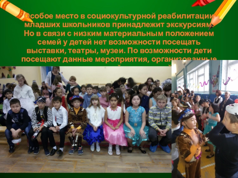 Слайд 19Особое место в социокультурной реабилитации младших школьников принадлежит экскурсиям. Но в