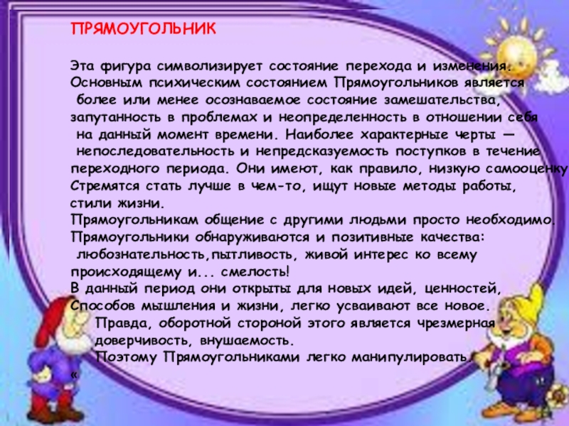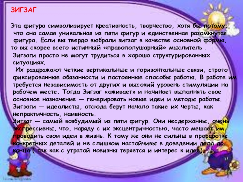 Зигзаг — самый возбудимый из пяти фигур. Они несдержанны, очень экспрессивны, что, наряду с их эксцентричностью, часто мешает им проводить свои идеи в жизнь. К тому же они не сильны в проработке конкретных деталей и не слишком настойчивы в доведении дела до конца ( так как с утратой новизны теряется и интерес к идее).