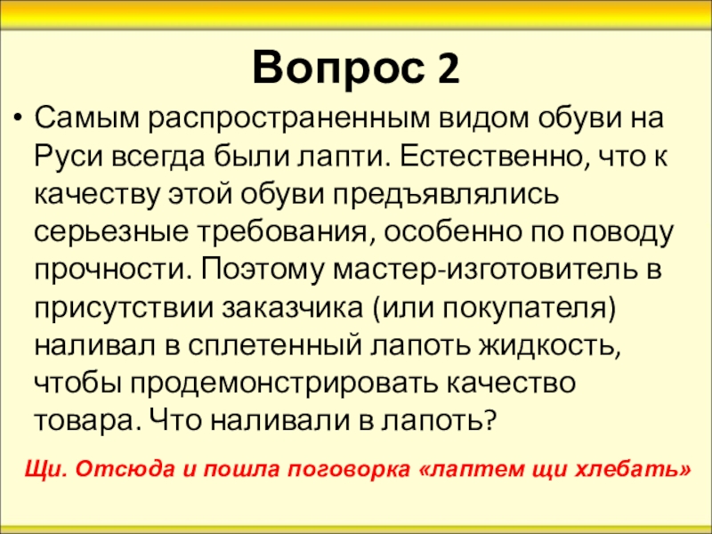 Щи. Отсюда и пошла поговорка «лаптем щи хлебать»